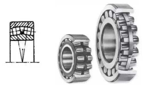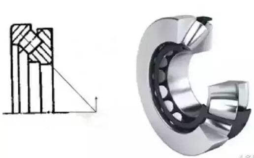 該類軸承中球面滾子傾斜排列,由于座圈滾道面呈球面,具有調(diào)心性能,因此可允許軸有若干傾斜,軸向負(fù)荷能力非常大,在承受軸向負(fù)荷的同時還可承受若干徑向負(fù)荷,使用時一般采用油潤滑。