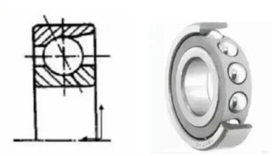 套圈與球之間有接觸角,標(biāo)準(zhǔn)的接觸角為15°、30°和40°,接觸角越大軸向負(fù)荷能力也越大,接觸角越小則越有利于高速旋轉(zhuǎn),單列軸承可承受徑向負(fù)荷與單向軸向負(fù)荷。結(jié)構(gòu)上為背面組合的兩個單列角接觸球軸承共用內(nèi)圈與外圈,可承受徑向負(fù)荷與雙向軸向負(fù)荷。