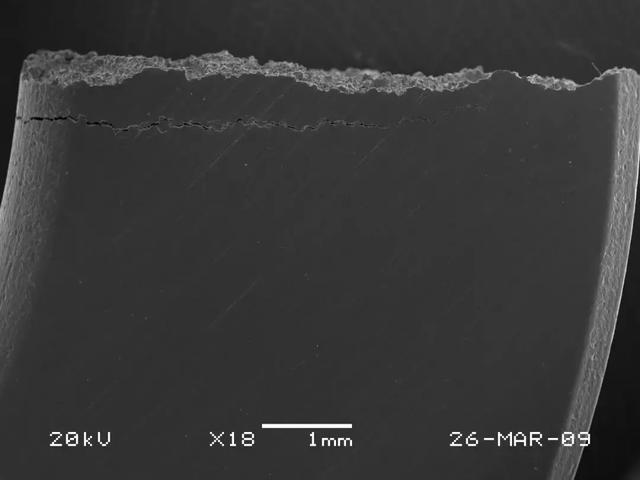 圖7 墊片端面上的裂紋形貌(左側(cè)為內(nèi)徑面)