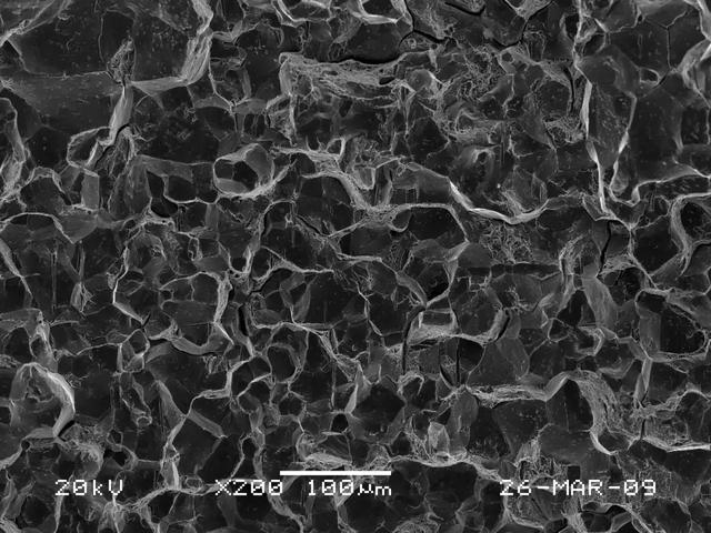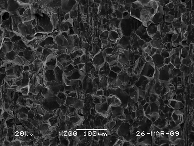 ①斷口的擴展方向為從一側(cè)端面的內(nèi)徑倒角處開始沿著對角線方向向另一端面擴展;斷裂方式為沿晶脆性斷裂;斷口截面上未發(fā)現(xiàn)有晶粒粗大、過燒及大尺寸夾雜物等現(xiàn)象(見圖4~圖6)。