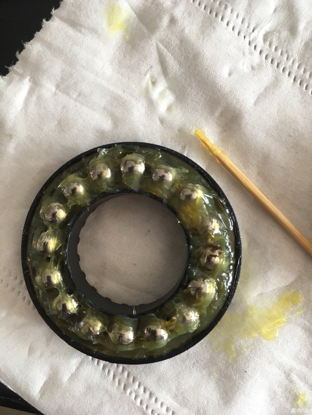 16顆鋼珠用眼鏡布再次清潔后依次放入,每次換頂膠保養(yǎng)一次,此軸承可以用一輩子。