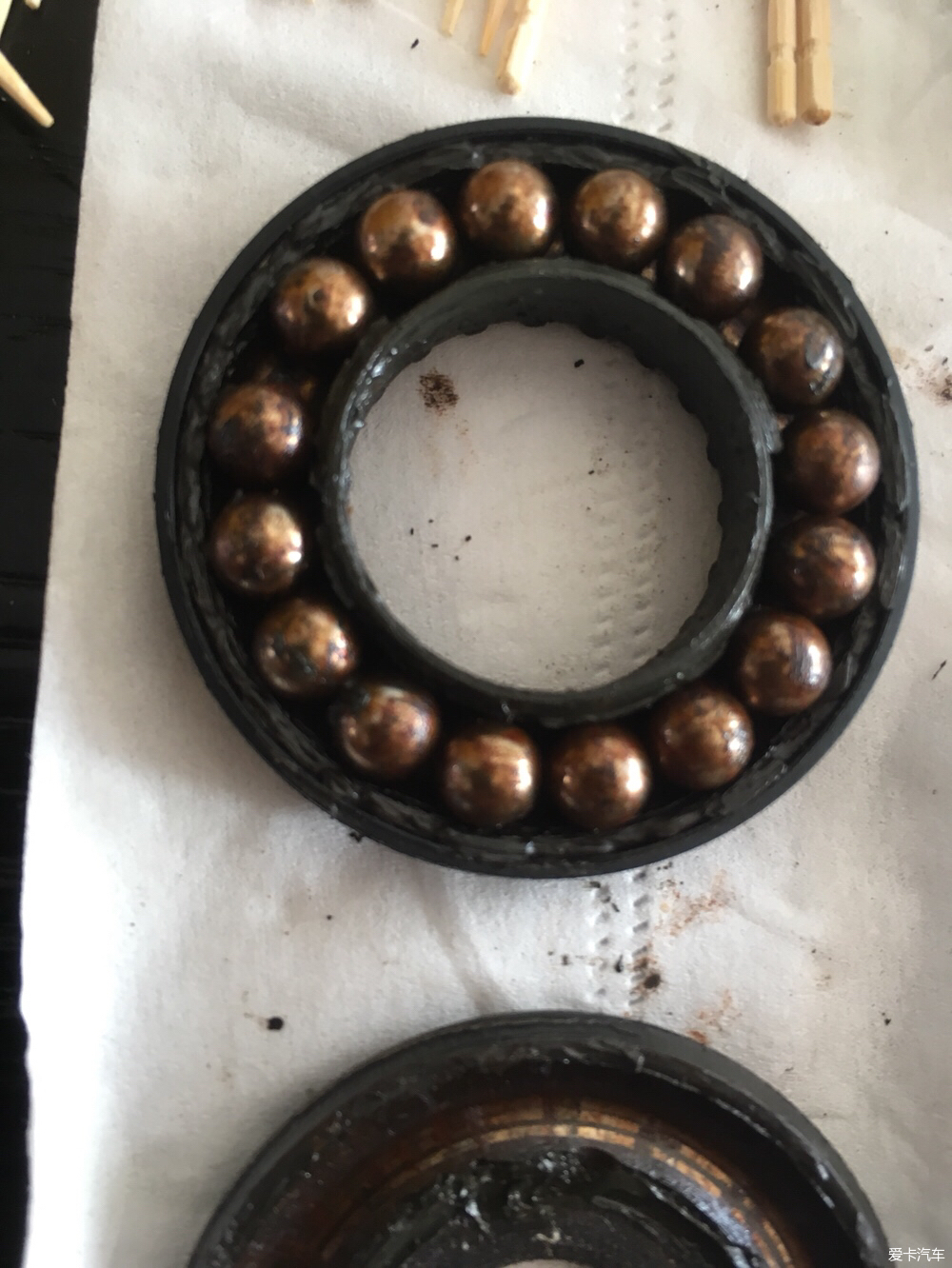 第二遍擦拭,縫隙里用牙刷清理干凈 擦的一塵不染??梢宰⒁庀逻@個(gè)原車平面軸承的標(biāo)示 下面有網(wǎng)購(gòu)的