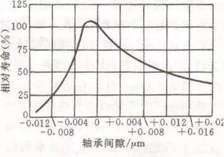 主軸回轉(zhuǎn)軸線的漂移,提高了旋轉(zhuǎn)精度。若過(guò)盈量太大,軸承的摩擦磨損加劇,使受力將顯著下降,軸承壽命與間隙之間的關(guān)系如圖7-14所示