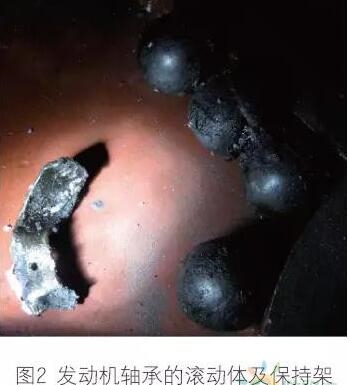 由于發(fā)電機轉(zhuǎn)子與軸承內(nèi)圈劇烈摩擦,軸承和發(fā)電機軸前端的高溫使軸承內(nèi)的油脂蒸發(fā)、氣化,并產(chǎn)生大量的可燃氣體。個別油脂分子在高溫下,還可能出現(xiàn)分子鏈斷裂,產(chǎn)生的可燃氣體不需要明火在高溫下就能點燃,有的油脂分子則在軸承中碳化變黑,如圖2 所示。