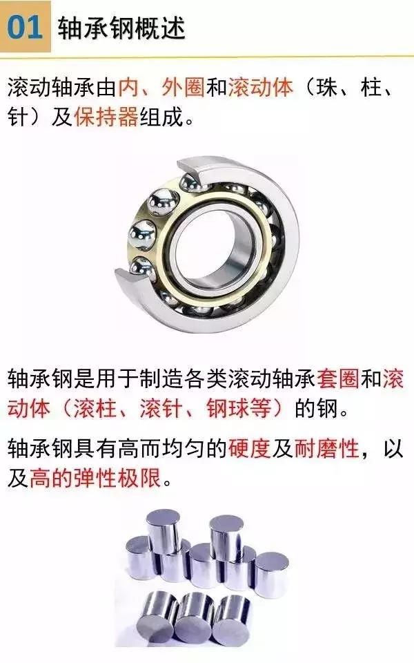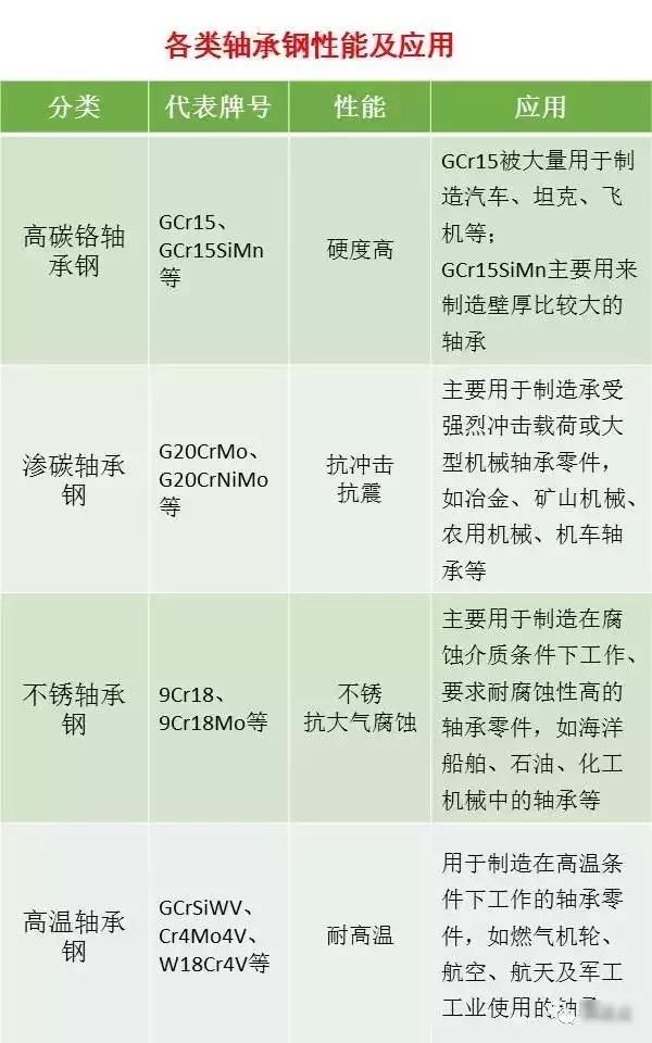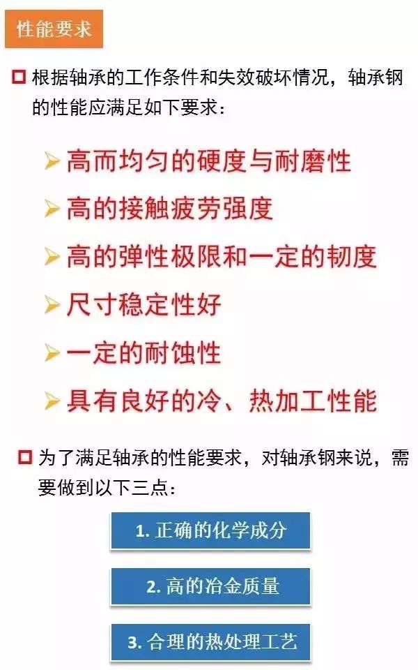 軸承鋼是用于制造滾動(dòng)軸承的滾動(dòng)體和內(nèi)外套圈的鋼,通常在淬火狀態(tài)下使用。滾動(dòng)軸承在工作中需承受很高的交變載荷,滾動(dòng)體與內(nèi)外圈之間的接觸應(yīng)力大,同時(shí)又工作在潤(rùn)滑劑介質(zhì)中。因此,滾動(dòng)軸承鋼具有高的抗壓強(qiáng)度和抗疲勞強(qiáng)度,有一定的韌性、塑性、耐磨性和耐蝕性,鋼的內(nèi)部組織成分均勻,熱處理后有良好的尺寸穩(wěn)定性。