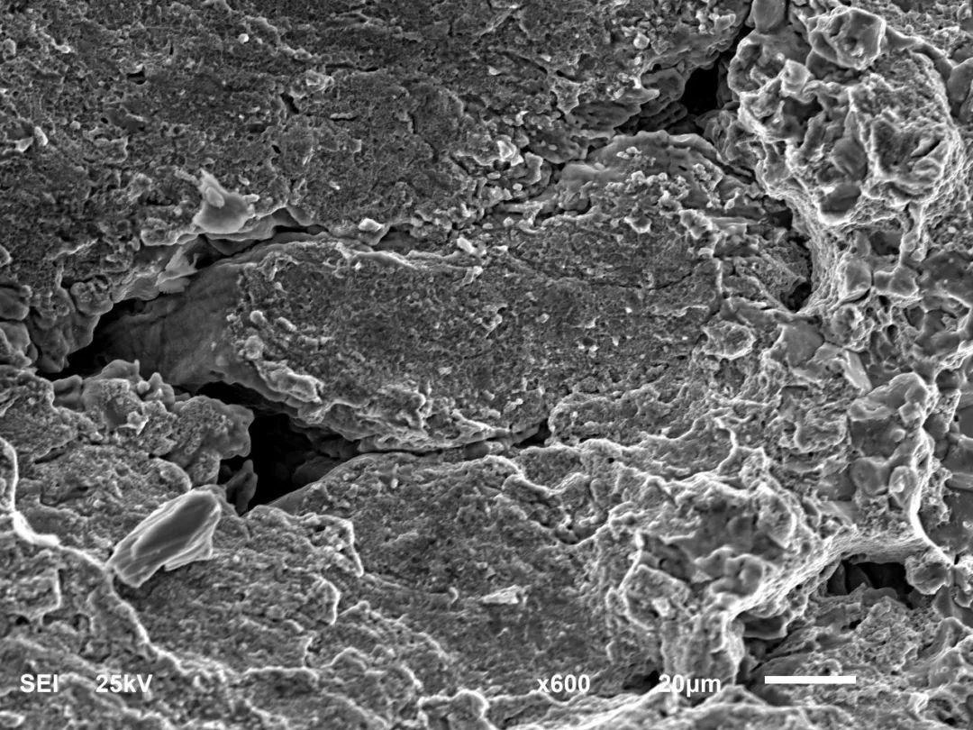 首先,低倍觀察。制取孔洞部位斷口試樣口后觀察,可見斷口表面粗糙,上有閃閃發(fā)光的晶粒棱面,除此以外,還分布有孔洞,俗稱“豆腐渣”斷口,其斷口形貌如圖2a所示。