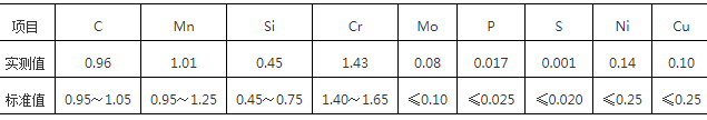 對外圈進行取樣,大小為15mm×15mm×15mm,采用直讀光譜儀進行化學成分分析,檢驗結(jié)果如表1所示,其化學成分符合GB/T18254—2016中GCr15SiMn標準要求。