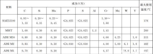 當(dāng)軸承工作溫度低于175攝氏度時(shí),可采用普通的SAE52100軸承鋼。MHT軸承鋼是在SAE52100中添加1.3%的鋁,它的工作溫度可提升到260攝氏度。M-50適用溫度在170~315攝氏度。M1和M2在500攝氏度時(shí)硬度還能滿足要求,但這也達(dá)到它們抗氧化性能的極限。WB-49滲碳鋼雖然高溫性能好,可以在537攝氏度工作,但是目前的制造工藝還不足以做出可靠的滾珠,而只能用來做內(nèi)、外環(huán)。滾珠則采用M1材質(zhì)。