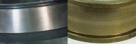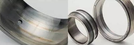 滾道、滾動(dòng)體以及保持架在旋轉(zhuǎn)中急劇發(fā)熱直至變色、軟化、熔敷和破損。造成燒傷的原因有潤(rùn)滑不良,過(guò)大載荷(預(yù)壓過(guò)大),轉(zhuǎn)速過(guò)大,游隙過(guò)小,水、異物的侵入,軸、軸承箱的精度不良,軸的撓度大等。