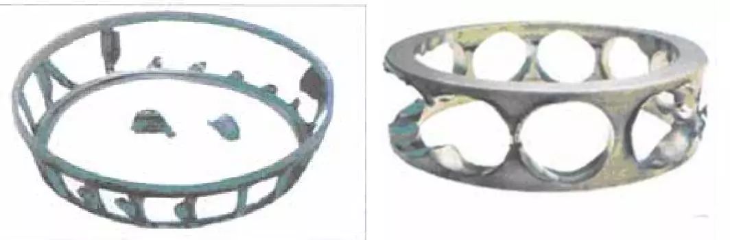 e. 保持架材料缺陷(如裂紋、大塊異金屬夾雜物、縮孔、氣泡)及鉚合缺陷(缺釘、墊釘或兩半保持架結(jié)合面空隙,嚴(yán)重鉚傷)等均可能造成保持架斷裂。