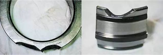 溝道單側(cè)極限位置剝落主要表現(xiàn)在溝道與擋邊交界處有嚴(yán)重的剝落環(huán)帶。產(chǎn)生原因是軸承安裝不到位或運(yùn)轉(zhuǎn)過(guò)程中突發(fā)軸向過(guò)載。