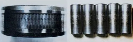 對(duì)稱位置剝落表現(xiàn)在內(nèi)圈為周圍環(huán)帶剝落,而外圈呈周向?qū)ΨQ位置剝落(即橢圓的短軸方向),原因主要是因?yàn)橥鈿た讬E圓過(guò)大或兩半分離式外殼孔結(jié)構(gòu),這在摩托車用凸輪軸軸承中表現(xiàn)尤為明顯。當(dāng)軸承壓入橢圓偏大的外殼孔中或兩半分離式外殼固緊時(shí),軸承外圈產(chǎn)生橢圓,在短軸方向的游隙明顯減少甚至負(fù)游隙。軸承在載荷的作用下,內(nèi)圈旋轉(zhuǎn)產(chǎn)生周向剝落痕跡,外圈只在短軸方向的對(duì)稱位置產(chǎn)生剝落痕跡。這是該軸承早期失效的主要原因,經(jīng)對(duì)該軸承失效件檢驗(yàn)表明,該軸承外徑圓度已從原工藝控制的0.8um變?yōu)?7um。此值遠(yuǎn)遠(yuǎn)大于徑向游隙值。因此,可以肯定該軸承是在嚴(yán)重變形及負(fù)游隙下工作的,工作面上易早期形成異常的急劇磨損與剝落。