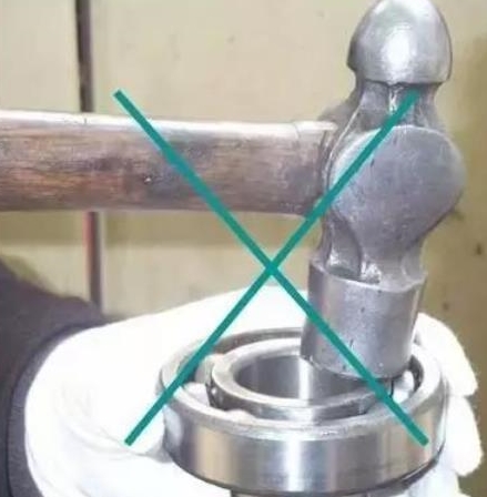 a.軸承套圈與軸或殼是過渡或過盈的小型軸承,直接用機(jī)械或液壓方式,壓入軸上或殼上,只要施力于過盈配合的軸承套圈上即可,注意不要用鐵錘直接錘擊,可以通過一個套筒再錘擊套筒的方法,輕輕敲擊套筒把軸承裝到合適的位置。且敲擊時(shí)應(yīng)盡量均勻的作用在軸承套圈上,以防止軸承傾斜或歪斜。不能通過滾動體傳遞力,否則會在軸承工作表面造成壓傷,軸承會很快損壞。