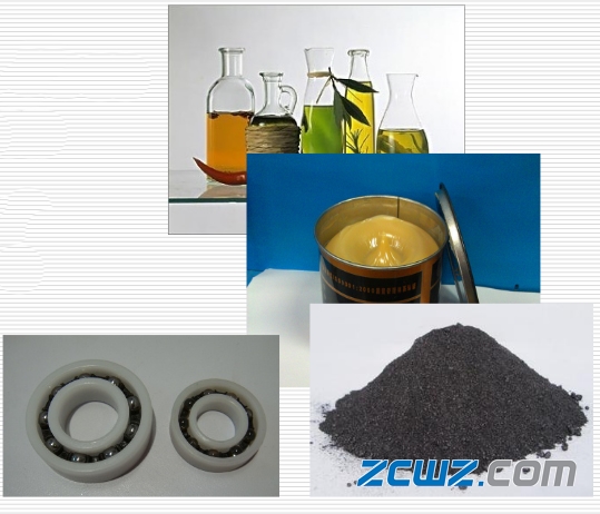 5、固體潤滑劑:在相對運動的承載表面間為減少摩擦和磨損,所用的粉末狀或薄膜狀的固體物質(zhì)。它主要用于不能或不方便使用油脂的摩擦部位。常用的固體潤滑材料有:石墨,二硫化鉬、滑石粉、聚四氟乙烯、尼龍、二硫化鎢、氟化石墨、氧化鉛等。