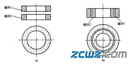 永磁軸承可以由徑向或軸向磁化環(huán)構(gòu)成。剛度和承載力可以通過采用多對磁環(huán)疊加的方法來增加。如圖1-3a所示,當磁環(huán)1和磁環(huán)2采用軸向充磁,且極性相同裝配時構(gòu)成吸力型徑向軸承,按極性相對裝配時則構(gòu)成斥力型推力軸承。如圖3b所示,當磁環(huán)軸向充磁,且按極性相同裝配時構(gòu)成斥力型徑向軸承,按極性相對裝配時則構(gòu)成吸力型推力軸承。如果結(jié)合徑向磁化情況可構(gòu)成更多的結(jié)構(gòu)形式。
