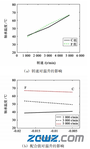 (3) 圓錐滾子軸承在運(yùn)行過程中多種參數(shù)都會(huì)對(duì)軸承的性能造成影響。在 0~6 000 r/min 轉(zhuǎn)速內(nèi),對(duì)于被測(cè)圓錐滾子軸承,軸承外圈應(yīng)采用間隙配合,內(nèi)圈采用過盈配合。在一定轉(zhuǎn)速內(nèi),軸承外圈的配合精度對(duì)溫升的影響會(huì)隨著內(nèi)圈過盈量增大而減小。