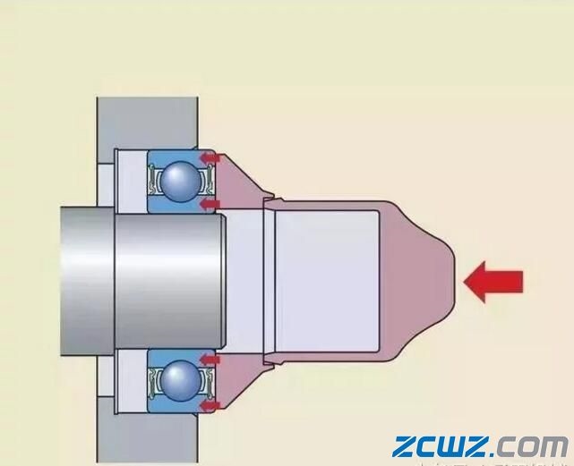 安裝內(nèi)圈(或外圈)過(guò)盈配合的軸承,禁止用鐵錘直接敲擊軸承內(nèi)圈(或外圈)端面,這樣很容易把擋邊敲壞。應(yīng)該采用套筒放在內(nèi)圈(或外圈)端面上,用鐵錘敲擊套筒來(lái)安裝。