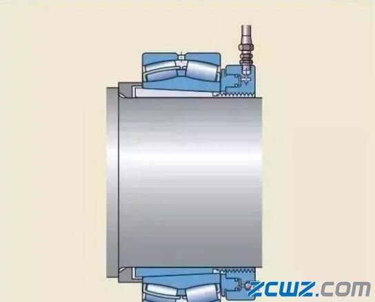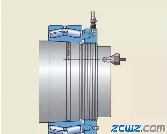注油法的工作原理是:液壓油在高壓下通過(guò)油孔和油槽,注入軸承和軸徑之間的配合面,形成一層油膜。油膜將配合面分開(kāi),使得配合面之間的摩擦大幅減少。這種方法通常用于直接把軸承安裝在圓錐形軸徑上的情況。必須的油孔和油槽應(yīng)是整體軸設(shè)計(jì)的一部分。如果緊定套和退卸套,已加工有油孔油槽,這種方法也可用于將軸承安裝在緊定套或退卸套上。
