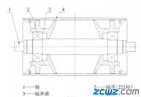 皮帶機用在礦山生產(chǎn)中,機尾滾筒的主要作用為皮帶換向,其結(jié)構(gòu)如圖1,工況環(huán)境較差,高轉(zhuǎn)速、載荷重、軸距長。如果潤滑不及時或者出現(xiàn)漏油等就會造成軸承發(fā)熱變色,進而燒傷抱死。如何在拆檢時快速方便的更換軸承顯得尤為重要。