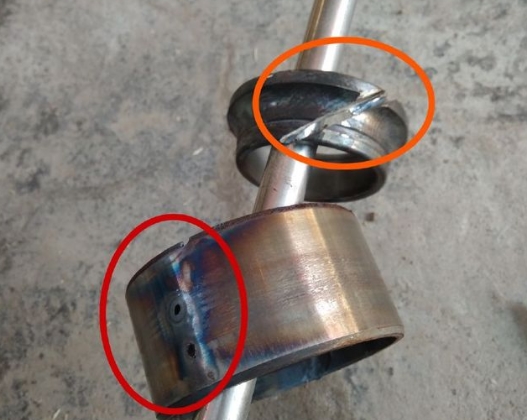 汽修師傅用了一個多小時,才把卡在軸頭上的內(nèi)圓以及卡在轉(zhuǎn)向節(jié)內(nèi)的外圓給敲出來!下圖紅色區(qū)域所示的是軸承外圓,我們可以看出它上面的痕跡!橙色區(qū)域所示是卡在軸頭上的軸承內(nèi)圓,切割機的痕跡!