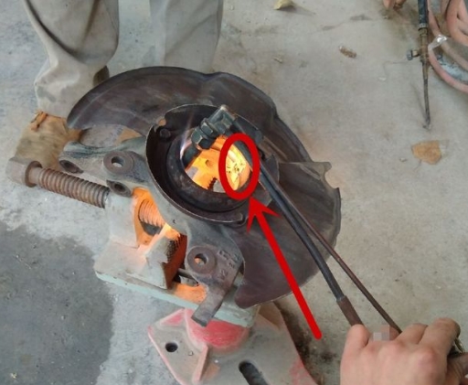 下圖箭頭所示,汽修師傅把軸承內(nèi)圓切割后,開始用錘和截子來把軸承外圓砸下來!要注意的是,一定不能把轉(zhuǎn)向節(jié)內(nèi)部給損壞,這就需要老師傅來做這個工作!