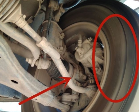 隨后,汽修師傅就開始檢查問題。汽修師傅把車升起來,然后另一位汽修師傅在車上讓輪胎高速轉(zhuǎn)動起來!紅色區(qū)域所示,輪胎正在高速運轉(zhuǎn)!汽修師傅判斷出噪音位置在箭頭所示的位置,也就是軸承有問題!