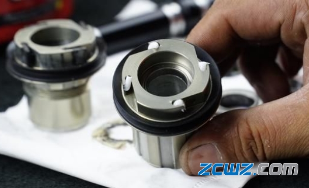 拆卸下來(lái)的預(yù)壓螺絲,可以看到內(nèi)部又一圈突起,是用來(lái)頂住花鼓殼體內(nèi)部那顆軸承的內(nèi)環(huán)以實(shí)現(xiàn)預(yù)壓,軸承的預(yù)壓非常有必要,切記,因?yàn)樵谳S心和軸承受力后,有一定預(yù)壓的軸承,滾珠的受力會(huì)更加均勻。
