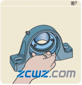 4、將第一個(gè)軸承單元滑到軸上,確保可以接觸其安裝環(huán)(圖3)。對(duì)于立式軸承座單元,將安裝螺栓或螺母擰上,但不要擰緊。對(duì)于法蘭軸承單元,應(yīng)在可行的情況下使用軸承座背部的定心凹槽,將之緊固到機(jī)構(gòu)的配合面上。