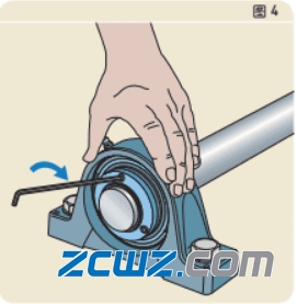 7、通過(guò)定位鎖緊環(huán)將第一個(gè)軸承單元固定到軸上,使平頭螺釘直接位于軸套上開(kāi)口部分的反方向位置。握住內(nèi)六角扳手的短柄處,手動(dòng)擰緊螺釘(圖4)。