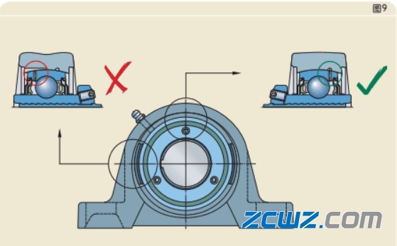 在安裝軸承時(shí),請(qǐng)確保軸承上的再潤(rùn)滑孔之一與軸承座中的再潤(rùn)滑槽相重合,并且不能與軸承座中的安裝槽口相重合,否則潤(rùn)滑脂會(huì)發(fā)生泄漏(圖9)。