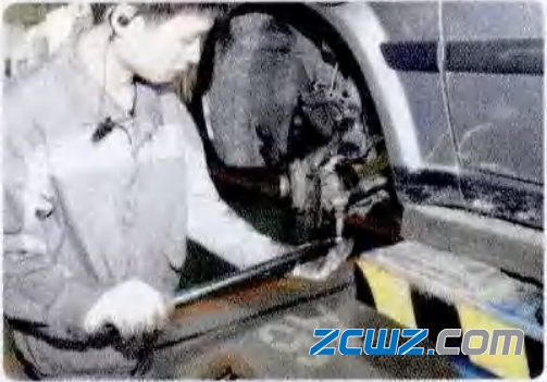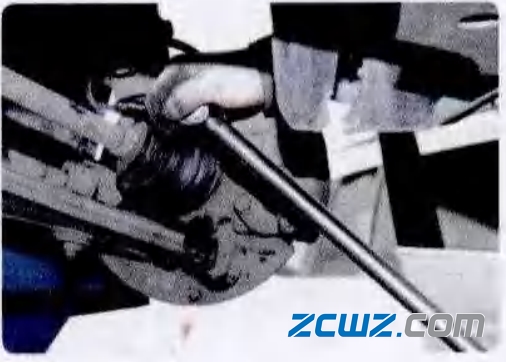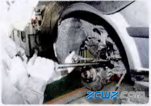 (4)半軸端部螺母的鎖緊力矩高達(dá)265 Nm ,因此無(wú)論是在拆卸還是安裝時(shí)都會(huì)比較費(fèi)力??梢哉?qǐng)另一名維修人員踩住制動(dòng)踏板,以提供反向力矩,或者是在舉升車輛之前先拆裝這一螺母,通過(guò)輪胎與地面的摩擦力提供反向力矩。