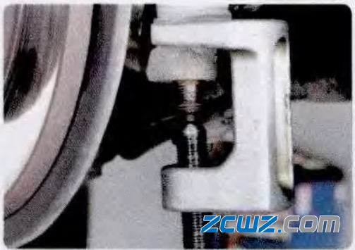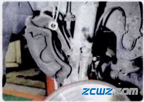 (3)拆下制動(dòng)卡鉗,并使用鋼絲掛鉤將其懸掛于車體上,以免制動(dòng)管路受力(如圖2所示)。