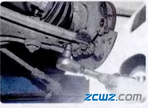 (4)拆下轉(zhuǎn)向拉桿球頭下的螺母,并使用球頭鉗使轉(zhuǎn)向節(jié)與轉(zhuǎn)向拉桿分離(如圖3所示)。嚴(yán)禁使用錘子直接敲打球頭,以免造成永久性損壞。