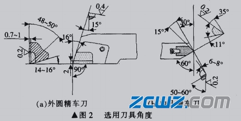 1)切削刀具的選擇。軸瓦的原材料一般為鋁青銅ZCuA110Fe3,其中主要合金元素Al含量為8.5%~11.0%,F(xiàn)e含量為2.0%~4.0%,具有高的力學性能。耐磨性和耐蝕性能好,抗拉強度crb≥490MPa,屈服強度s≥l80MPa,伸長率≥13%,是一種易切削合金,可以選擇普通的高速鋼或硬質(zhì)合金材料刀具。刀具要保證刃口鋒利.可以采用較大的前角和主偏角,刀具各角度的選擇見圖2所示。
