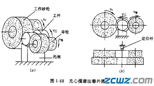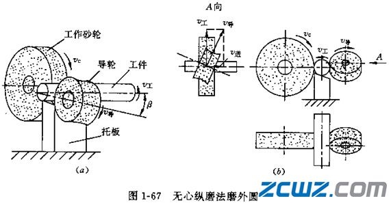 大輪為工作砂輪,起切削作用。小輪為導(dǎo)輪,無(wú)切削能力。兩輪與托板構(gòu)成V形定位面托住工件。由于導(dǎo)輪的軸線(xiàn)與砂輪軸線(xiàn)傾斜β角( β=1°~6°),v導(dǎo)分解成v工和v進(jìn)。 v工帶動(dòng)工件旋轉(zhuǎn), v進(jìn)帶動(dòng)工件軸向移動(dòng)。為使導(dǎo)輪與工件直線(xiàn)接觸,把導(dǎo)輪圓周表面的母線(xiàn)修整成雙曲線(xiàn)。無(wú)心縱磨法主要用于大批量生產(chǎn)中磨削細(xì)長(zhǎng)光滑軸、銷(xiāo)釘、小套等零件的外圓。