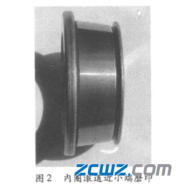 當(dāng)時也是軸承經(jīng)過運(yùn)行不到200個小時,軸承就損壞了,當(dāng)時進(jìn)行拆套后也是發(fā)現(xiàn)軸承外圈、保持架均完好無損壞,但是滾子靠近小頭的工作表面沿圈周圍方向有不同程度的剝落(如圖1),同時內(nèi)圈滾道靠近小端面油溝處沿圓周方向也存在一條磨印(如圖2)。