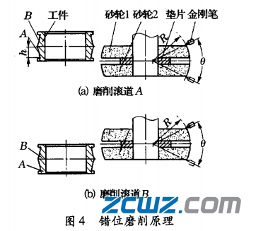 錯(cuò)位磨削法的原理:錯(cuò)位磨削法是一種新的磨削方法,采用工件錯(cuò)位跳動(dòng)磨削,實(shí)現(xiàn)了2片砂輪分別磨削2個(gè)滾道,最大限度地減少了因磨削力、磨削熱對(duì)工件加工精度、表面質(zhì)量及磨削效率的影響。磨削原理如圖4所示。2片砂輪用一定厚度的墊片隔開(kāi),金剛筆1次修整2片砂輪,砂輪1磨削滾道A(圖4a),磨削完成后,工件橫向跳動(dòng),再用砂輪2磨削滾道B(圖4b)。