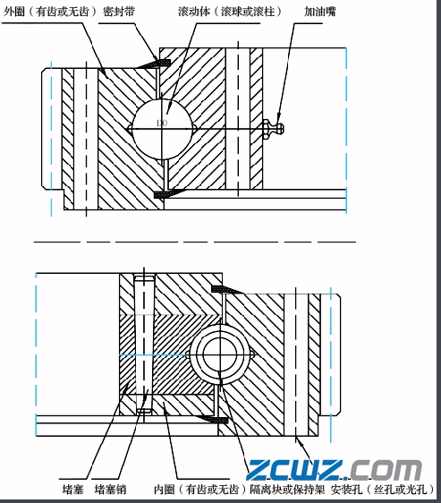 回轉(zhuǎn)軸承也稱為轉(zhuǎn)盤軸承,還可以叫回轉(zhuǎn)支承軸承,也有人稱這樣的軸承為:旋轉(zhuǎn)支承 ??偟膩碚f,這種軸承主要由外圈(有齒或無齒)、密封帶 、滾動體(滾球或滾柱)、加油嘴、堵塞、堵塞銷、內(nèi)圈(有齒或無齒)、隔離塊或保持架和安裝孔(絲孔或光孔)幾個部位組合而成的。