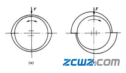 (a)為橢圓軸承,工作時,可形成上下兩個動壓油膜,有助于提高穩(wěn)定性。這類軸承的加工也比較容易,在軸承的剖分面上墊上一定厚度的墊片,按圓形鏜孔,然后撤去墊片,上下合攏即為橢圓軸承。