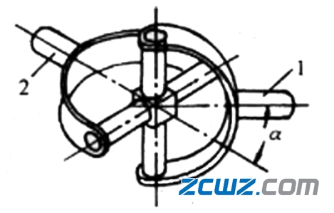 當(dāng)一軸固定時(shí),另一軸可以在任意方向偏斜α角, 角位移最大可達(dá)45°。當(dāng)主動(dòng)軸以等角速度ω1,回轉(zhuǎn)時(shí),從動(dòng)軸的角速度ω2,將在一定范圍(ω1cosα≤ω2≤ω1/cosα)內(nèi)作周期性的變化,從而引起動(dòng)載荷。