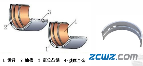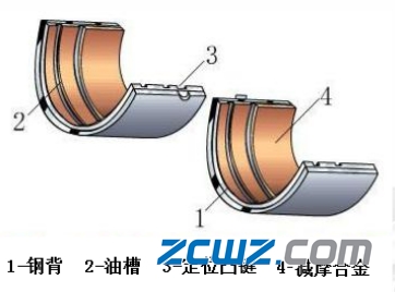 連桿軸承和主軸承均由上、下兩片軸瓦對合而成。每一片軸瓦都是由鋼背和減摩合金層或鋼背、減摩合金層和軟鍍層構(gòu)成,前者稱為二層結(jié)構(gòu)軸瓦,后者稱為三層結(jié)構(gòu)軸瓦。