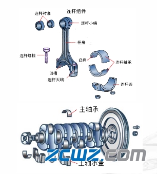 曲軸軸承包括連桿軸承和主軸承。它們的功用是保護軸頸及承孔,減輕摩擦和磨損。把活塞連桿組傳來的氣體力轉(zhuǎn)變?yōu)榕ぞ貙ν廨敵?。還用來驅(qū)動發(fā)動機的配汽機構(gòu)及其他各種輔助裝置。