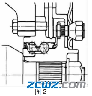 2.3 游隙設計參數(shù)不良:游隙設計不良導致軸承溝道點狀剝落問題,檢測軸承內部油脂含水量及點狀剝落材質均不能發(fā)現(xiàn)異常。輪轂軸承使用過程中只有負游隙偏緊能造成溝道剝落問題,負游隙需要鎖緊螺母鎖緊來實現(xiàn)(如圖 2 所示)。