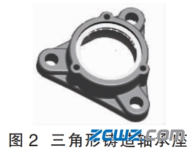 為了適應(yīng)農(nóng)業(yè)機(jī)械結(jié)構(gòu)要求,設(shè)計(jì)采用了帶座外球面軸承類(lèi)型,它是由外球面球軸承和一個(gè)軸承座組成,該種軸承的外圈具有球面外徑,與軸承座的凹球面內(nèi)孔相配合,具有自動(dòng)調(diào)心功能,適用于剛性差、擾度較大的通軸。軸承座設(shè)計(jì)為三角形鑄造軸承座(圖2),軸承選用具有自動(dòng)調(diào)心、安裝方便、密封結(jié)構(gòu)完善的AEL系列帶偏心套外球面球軸承,此類(lèi)軸承主要特點(diǎn)為軸承上一端有一定的偏心度,并有同樣偏心度的偏心套與其配合。
