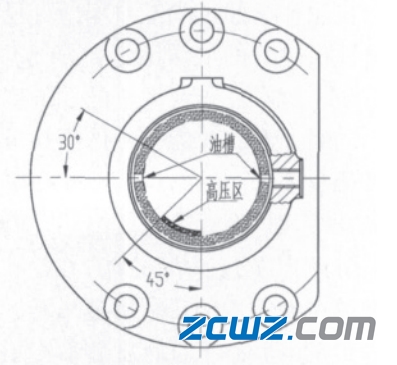 根據(jù)凸輪軸三種安裝狀態(tài)的受力分析,選擇了一個能同時滿足三種安裝狀態(tài)的軸承套油槽布置角度,如圖7所示的30°范圍的低油壓區(qū)域,修改有關圖紙文件,明確軸承套油槽安裝要求。