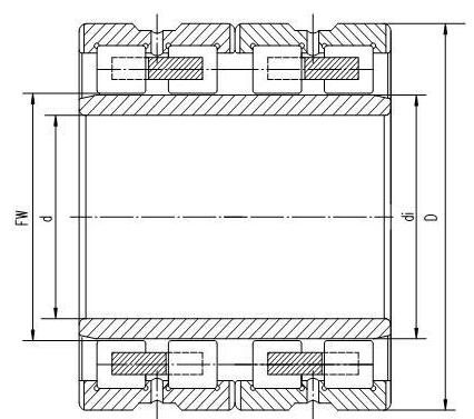 我國軋機(jī)用四列圓柱滾子軸承有兩套現(xiàn)行行業(yè)標(biāo)準(zhǔn),既JB/T5389.1-2005和JB4039-1985(現(xiàn)在已少有廠家使用)軋機(jī)用四列圓柱滾子軸承外形尺寸,在標(biāo)準(zhǔn)中規(guī)定了內(nèi)滾道直徑的公差為減公差,(見圖一和查閱JB/T5389.1-2005);以內(nèi)滾道尺寸公差為定值確定不同組別徑向游隙,加工外滾道尺寸來確定滾子內(nèi)復(fù)圓尺寸公差,F(xiàn)W值的公差系自由尺寸處理,沒有公差要求,在實(shí)際生產(chǎn)中就比較混亂。這就給鋼廠換輥工作造成了很大的困難。還有的廠家為了競爭的需要自行更改FW值,這些都給鋼廠日常工作造成了很大的工作難度。見圖一;