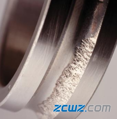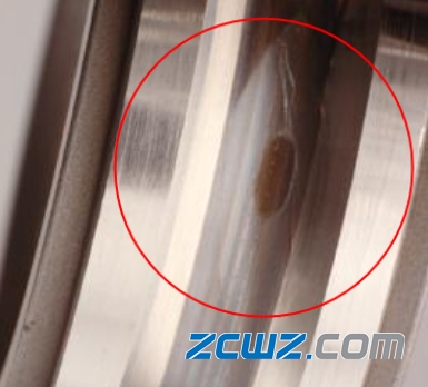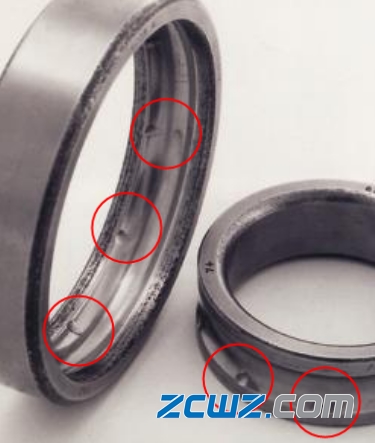 癥狀:球上出現(xiàn)球在滾道外邊緣上滾動(dòng)引起的溝蝕帶。