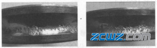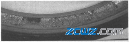 傷害三、拆套后,檢查深溝球軸承套圈溝道表面外觀質(zhì)量,內(nèi)圈溝道偏向大字端一側(cè),沿圓周方向剝落嚴(yán)重(如圖4所示),占溝道寬度的二分之一。而外圈溝道偏向打字端一側(cè),沿溝道圓周方向剝落也非常嚴(yán)重(如圖5所示),也占溝道寬度的二分之一。