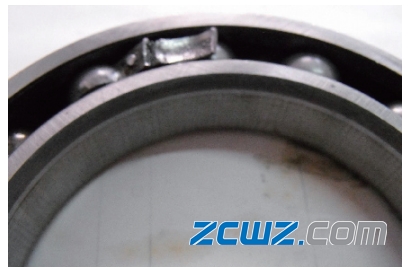 深溝球軸承在工作時承受了附加過大的軸向載荷,鋼球的工作軌跡偏離正常位置,使鋼球的接觸載荷增大,摩擦熱增大,造成不正常溫升,鋼球在高溫作用下發(fā)生尺寸脹大,游隙變小,鋼球擠壓保持架,導(dǎo)致保持形成斷裂,同時導(dǎo)致鋼球發(fā)生嚴(yán)重剝落現(xiàn)象,最終導(dǎo)致軸承卡死。