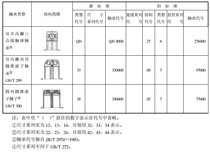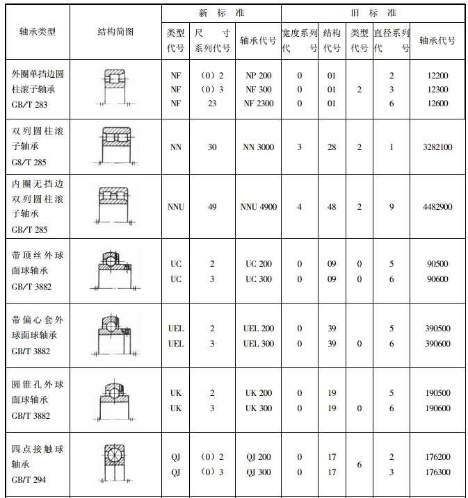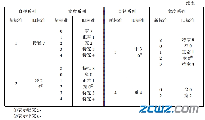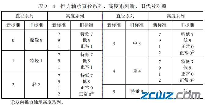 尺寸系列代號由軸承的寬(高)度系列代號和直徑系列代號組合而成。向心軸承、推力軸承尺寸系列代號見表2-2。向心軸承、推力軸承尺寸系列新舊代號對照見表2-3和表2一4。